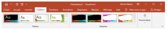 L’onglet Création contient tous les contrôles nécessaires pour mettre en forme vos diapositives : mise en page, styles et arrière-plan.