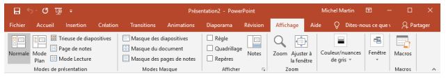 L'onglet Affichage permet de choisir le mode d’affichage, d’accéder aux masques de diapositives, de préciser le niveau de zoom, de répartir la zone de travail entre les différents diaporamas ouverts, d’accéder aux macros et bien d’autres choses encore.