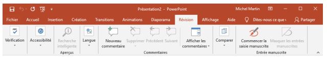 L'onglet Révision donne accès à des outils de vérification, permet d'ajouter des commentaires à vos diapositives et de comparer deux présentations.