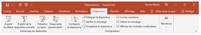 L'onglet Diaporama permet de configurer et d’exécuter la présentation en cours d’édition.