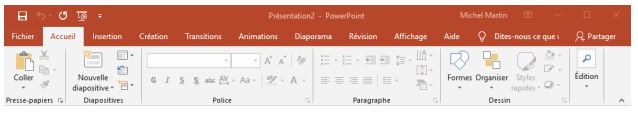 L'onglet Accueil rassemble les commandes les plus courantes : gestion du presse-papier, des polices, des diapositives, des styles et des outils d'édition.