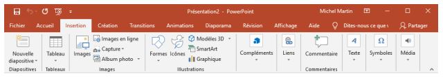 L'onglet Insertion permet d'insérer différentes informations dans un les diapositives : des tableaux, des illustrations, des graphiques, des liens hypertextes, des zones de texte, etc.