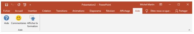Enfin, l’onglet Aide donne accès à différentes ressources pour vous aider dans votre utilisation quotidienne de PowerPoint.