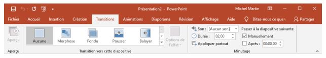 L’onglet Transitions permet de définir des animations entre les différentes diapositives de la présentation.