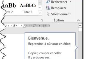 Word mémorise automatiquement la position où se trouvait le point d'insertion lorsque vous avez enregistré puis fermé le document. Grâce à cette fonctionnalité, il est très simple de reprendre votre travail à l'endroit exact où vous l'avez arrêté. Pour cela, ouvrez votre document, puis cliquez sur la bulle Bienvenue, à côté de la barre de défilement vertical.