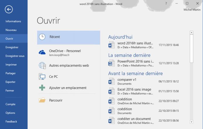 Pour ouvrir un document existant, sélectionnez l'onglet Fichier dans le ruban, puis cliquez sur Ouvrir (vous pouvez aussi appuyer sur Ctrl + O pour obtenir le même résultat). Les documents ouverts récemment apparaissent dans la partie droite de la fenêtre. Vous pouvez :