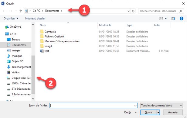 Si vous préférez, appuyez sur Ctrl + F12 pour afficher la boîte de dialogue Ouvrir. Cette boîte de dialogue affiche tous les documents lisibles par Word qui se trouvent dans le dossier d'ouverture par défaut. Si nécessaire, vous pouvez utiliser la barre d'adresse dans la partie supérieure de la boîte de dialogue, ou l’arborescence dans la partie gauche de la boîte de dialogue pour choisir l'emplacement qui contient le document à ouvrir.