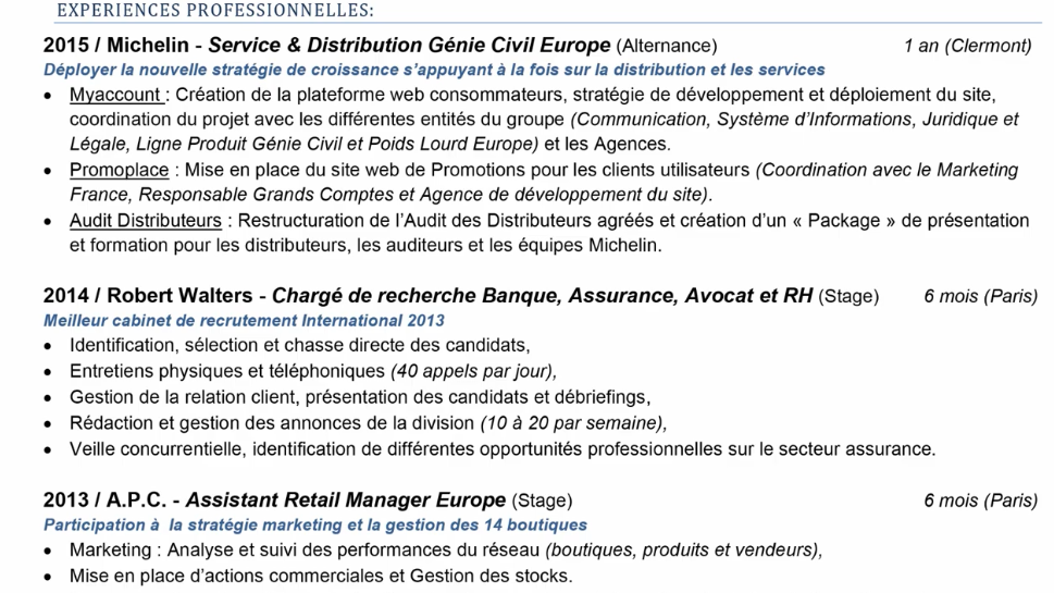 Pour les missions, il est normal d'avoir les mêmes missions d'un poste à un autre, cependant vous devez montrer une certaine progression dans les missions qui vous ont été confié. De plus, il est vraiment important de préciser avec des chiffres la quantité de travail que vous aviez (ex: 40 appels par jour ou Management de 10 pers.)